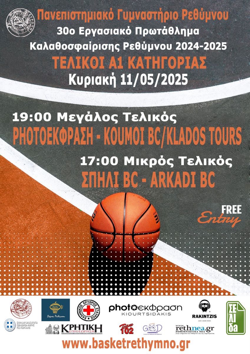 Το Πανεπιστημιακό Γυμναστήριο Ρεθύμνου και η οργανωτική επιτροπή του 30ου Εργασιακού Πρωταθλήματος Καλαθοσφαίρισης 2024-2025, σας προσκαλεί την Κυριακή 11 Μαΐου 2025 και ώρα 19:00, στο Κλειστό Πανεπιστημιακό Γυμναστήριο Ρεθύμνου για να παρακολουθήσετε τον Μεγάλο Τελικό της Α1 κατηγορίας του πρωταθλήματος.