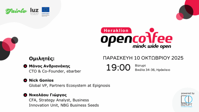 Το 30ο Open Coffee Heraklion έρχεται την Παρασκευή 10 Οκτωβρίου, στις 19:00, στο Bizrupt (Βικέλα 34-36, Ηράκλειο). Σε αυτό το Open Coffee Heraklion meetup, θα έχουμε τη χαρά να φιλοξενήσουμε: