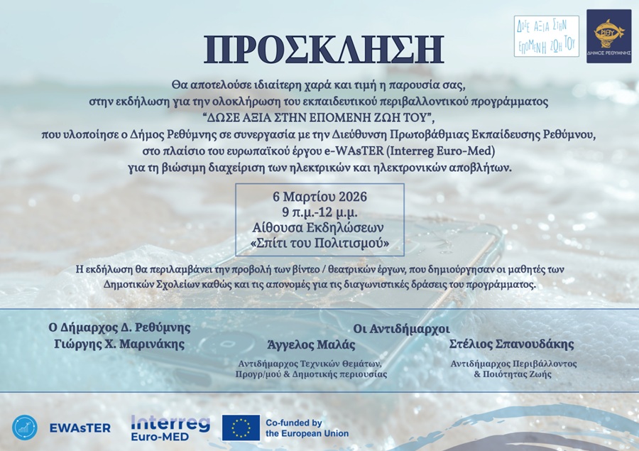 Πρόκειται για το Εκπαιδευτικό Περιβαλλοντικό Πρόγραμμα με τίτλο «Δώσε αξία στην επόμενη ζωή του», το οποίο υλοποιήθηκε σε συνεργασία με τη Διεύθυνση Πρωτοβάθμιας Εκπαίδευσης Ρεθύμνου, στο πλαίσιο του ευρωπαϊκού έργου e-WAsTER (Interreg Euro-Med) για τη βιώσιμη διαχείριση των ηλεκτρικών και ηλεκτρονικών αποβλήτων.