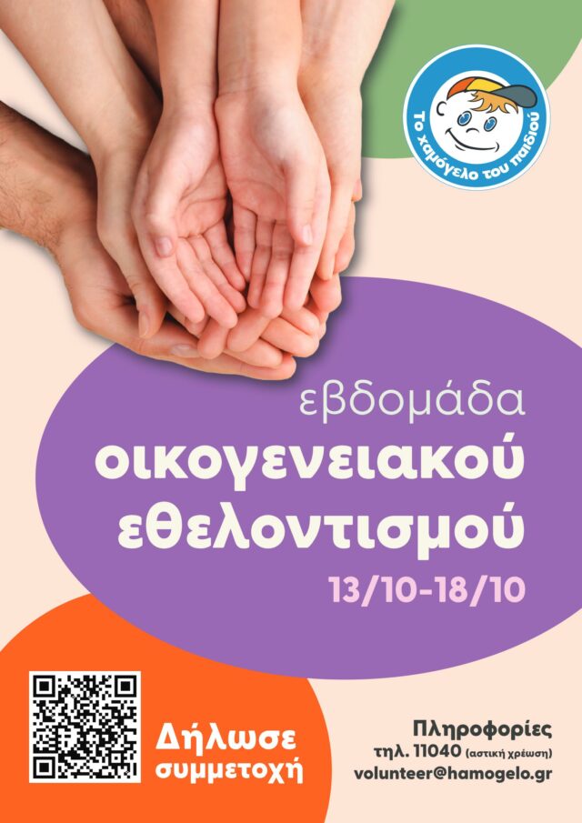 Με μεγάλη χαρά «To Χαμόγελο του Παιδιού», προσκαλεί μικρούς και μεγάλους στην Εβδομάδα Οικογενειακού Εθελοντισμού που θα πραγματοποιηθεί από τη Δευτέρα 13 Οκτωβρίου 2025 έως και το Σάββατο 18 Οκτωβρίου 2025 στα «Κέντρα Υποστήριξης παιδιών, νέων & ευάλωτων οικογενειών», πανελλαδικά (Αττική, Θεσσαλονίκη, Κόρινθος, Κρήτη – Ηράκλειο, Κρήτη – Ρέθυμνο, Κρήτη-Χανιά, Λάρισα, Πάτρα, Πύργος).