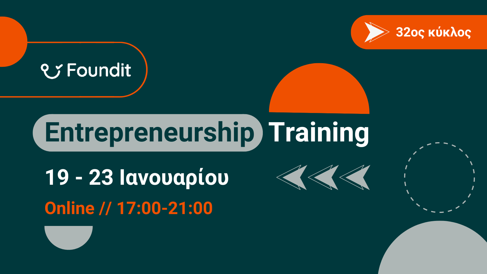 Ο 32ος κύκλος του προγράμματος θα ξεκινήσει με το FounditTraining19-23 Ιανουαρίου και οι αιτήσεις συμμετοχής γίνονται δεκτές μέχρι τις 12 Ιανουαρίου. Όλα τα trainings πραγματοποιούνται από έμπειρους/ες επαγγελματίες και γίνεται επιλογή των συμμετεχόντων για την καλύτερη απόδοση και μεγιστοποίηση των οφελών του προγράμματος.