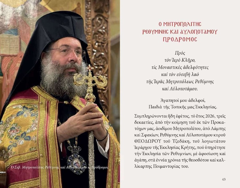 Κυκλοφορήθηκε το Ημερολόγιο της Ιεράς Μητροπόλεως Ρεθύμνης και Αυλοποτάμου για το έτος 2026, το οποίο είναι αφιερωμένο στον μακαριστό, από Λάμπης και Σφακίων, Μητροπολίτη Ρεθύμνης και Αυλοποτάμου Θεόδωρο τον Τζεδάκη, με αφορμή τη συμπλήρωση 30 ετών από της εις Κύριον εκδημίας του.