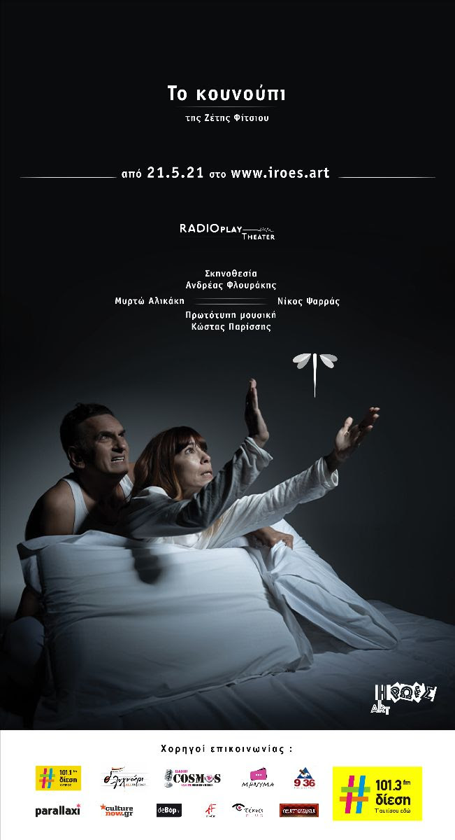 Το www.iroes.art, μετά την άκρως επιτυχημένη πορεία του πρώτου Radio Play Theater «Το Πάτωμα» και τους 35.000 ακροατές του, επιστρέφει με το νέο θεατρικό έργο της Ζέτης Φίτσιου με τίτλο «Το κουνούπι». Το έργο θα παρουσιαστεί ως ακουστική παράσταση σε σκηνοθεσία Ανδρέα Φλουράκη με τους Μυρτώ Αλικάκη και Νίκο Ψαρρά.