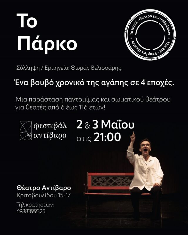 «Το Παιδί – Θέατρο των Ανθρώπων» παρουσιάζει την παράσταση μιμικής και σωματικού αυτοσχεδιασμού: «Το Πάρκο» – Ένα βουβό χρονικό της αγάπης σε 4 εποχές με τον Θωμά Βελισσάρη στο Φεστιβάλ Αντίβαρο στο Ρέθυμνο!