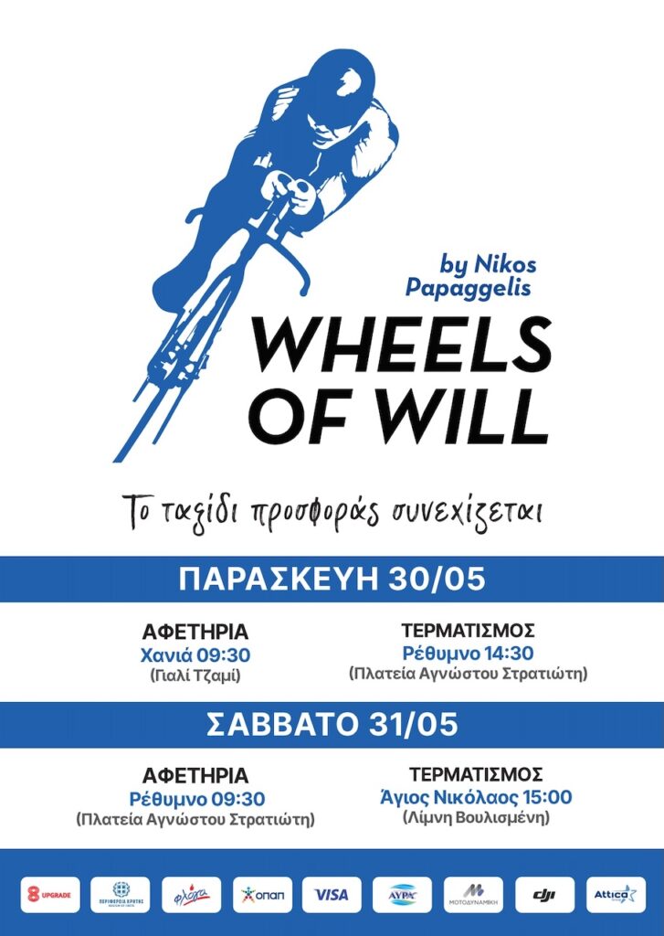 Την Παρασκευή και το Σάββατο, 30 και 31 Μαΐου το Ρέθυμνο θα αποτελέσει έναν από τους σταθμούς του κορυφαίου Έλληνα παραποδηλάτη ο οποίος αποτελεί πρότυπο κατάθεσης ψυχής και αγάπης για τη ζωή στο πλαίσιο της φιλανθρωπικής δράσης «Wheels of Will».