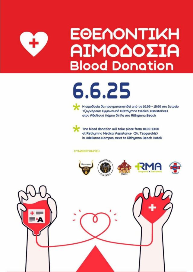 Το Ρέθυμνο Cretan Kings, ενημερώνει τους φίλους του, ότι την Παρασκευή 6 Ιουνίου, στο πλαίσιο του Κοινωνικού προγράμματος, Cretan Kings Assist διοργανώνει Εθελοντική Αιμοδοσία, σε συνεργασία με τα ιατρεία Rethymno Medical Assistance και το Γενικό Νοσοκομείο Ρέθυμνου.