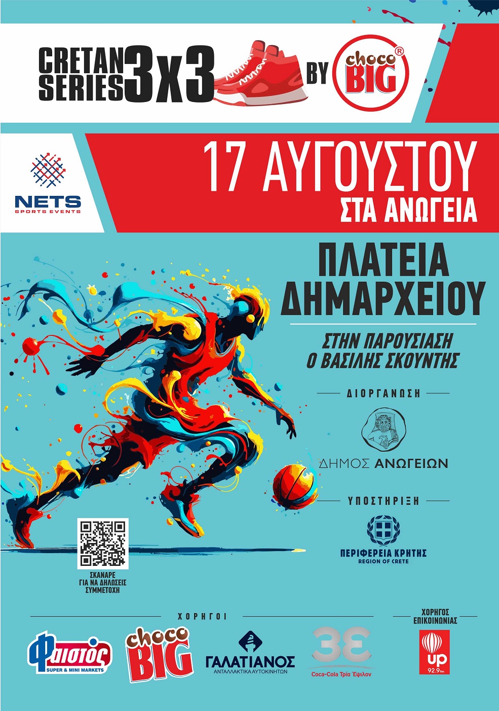 Το 8ο Τουρνουά 3x3 Basketball Cretan Series by choco BIG συνδιοργανώνεται από τον Δήμο Ανωγείων και τηNets Sports Events με την υποστήριξη της Περιφέρειας Κρήτης.