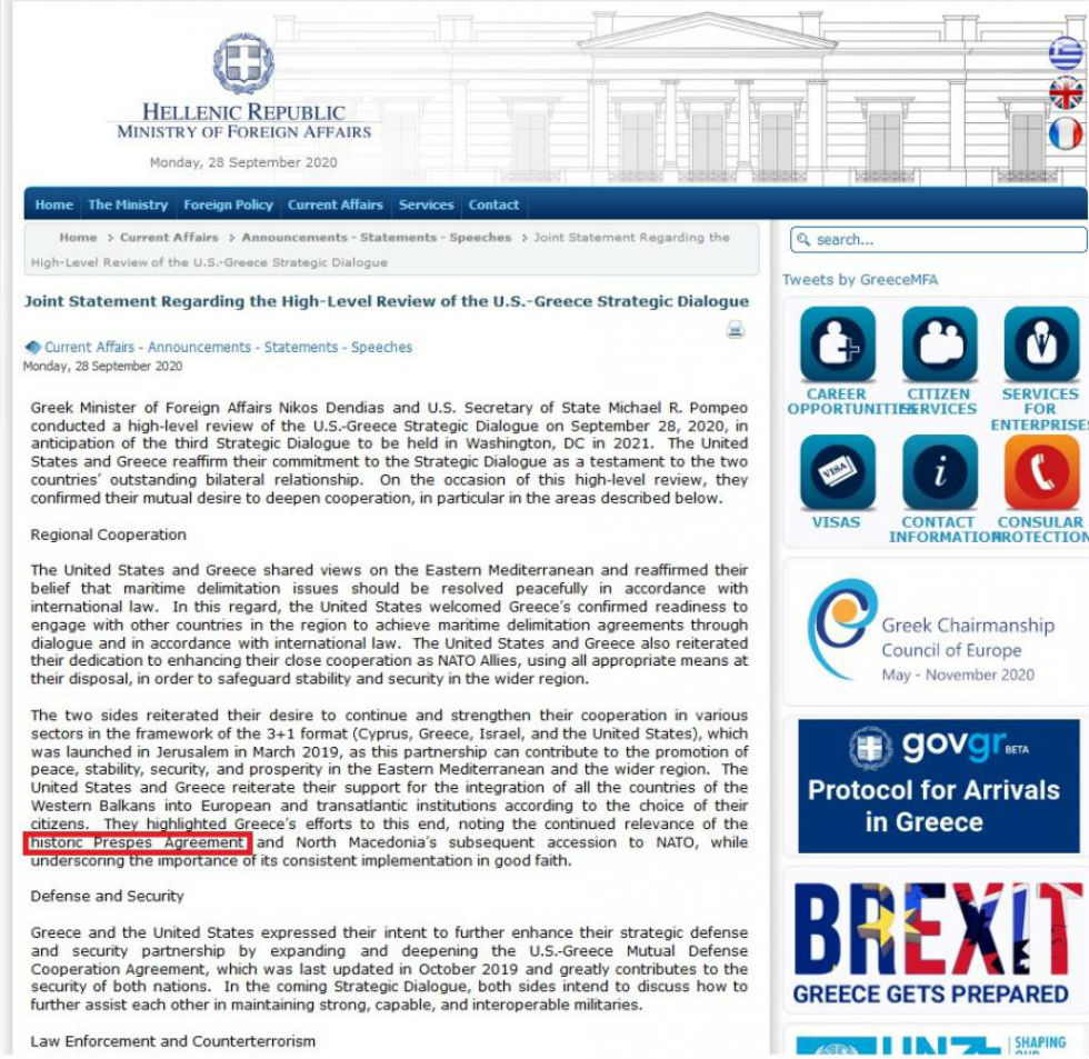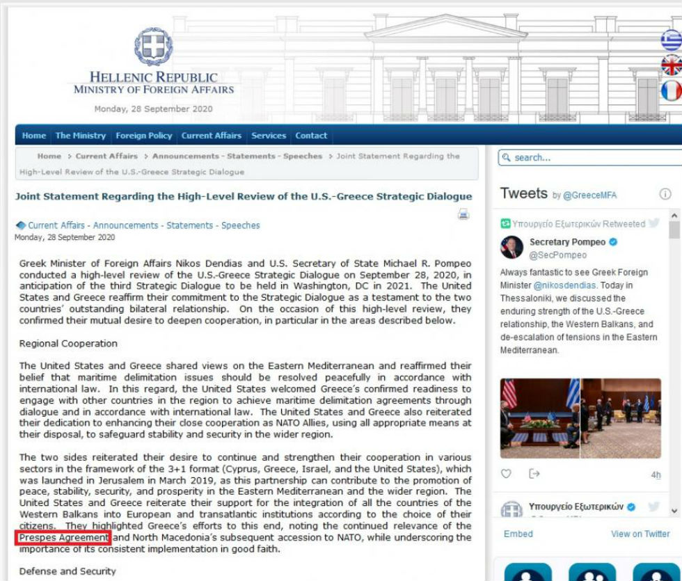 Μετά τη συνάντηση των υπουργών Εξωτερικών Ελλάδας και Ηνωμένων Πολιτειών, Ν. Δένδια και Μ. Πομπέο, εκδόθηκε κοινό ανακοινωθέν όπου η «Συμφωνία των Πρεσπών» χαρακτηριζόταν «ιστορική». Στο γαλάζιο στρατόπεδο χτύπησαν καμπανάκια και μερικές ώρες αργότερα η λέξη «εξαφανίστηκε». Ταυτόχρονα ο συγκεκριμένος όρος εξαφανίστηκε και από την ιστοσελίδα της αμερικανικής πρεσβείας στην Ελλάδα!