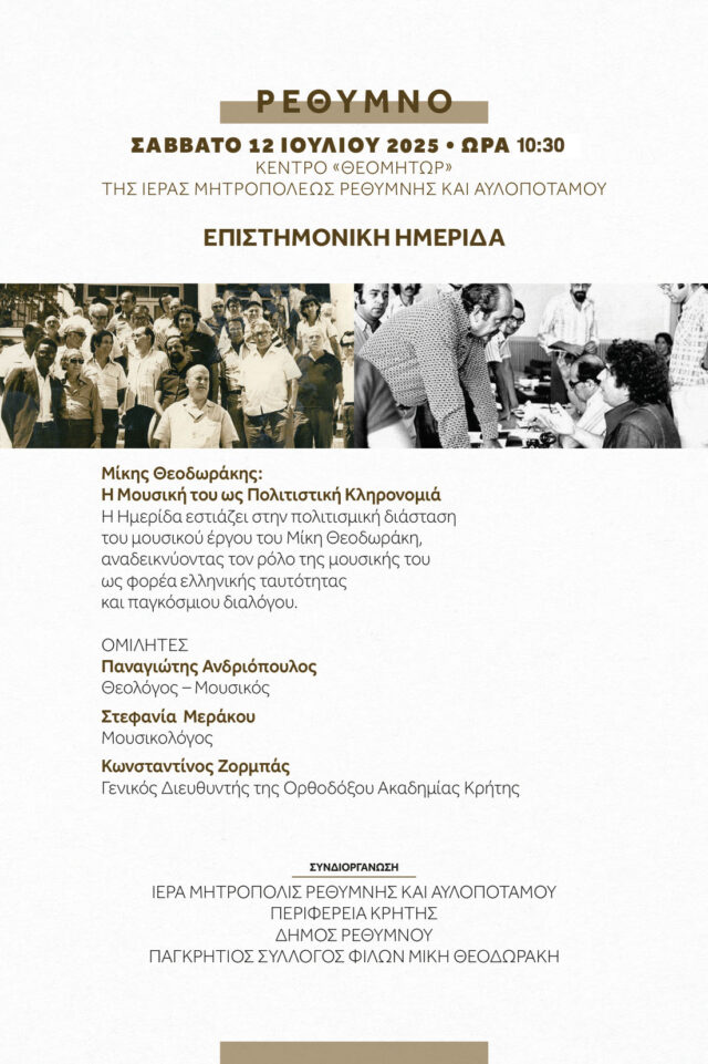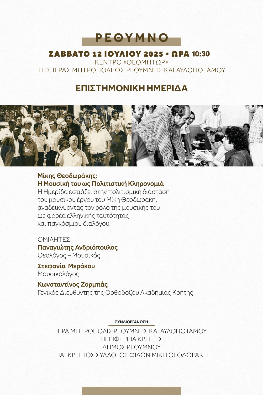 Η Ορθόδοξος Ακαδημία Κρήτης και ο Σύλλογος Φίλων «Μίκη Θεοδωράκη», σε συνδιοργάνωση με την Ιερά Μητρόπολη Ρεθύμνης και Αυλοποτάμου, την Περιφέρεια Κρήτης, τον Δήμο Χανίων, τον Δήμο Ρεθύμνης, τον Δήμο Ηρακλείου και το Φεστιβάλ Βιβλίου Χανίων, και με αφορμή την απόφαση του Υπουργείου Πολιτισμού να ανακηρύξει το έτος 2025 ως Έτος Μίκη Θεοδωράκη, διοργανώνει μία «Τριλογία Ιδεών» αφιερωμένη στη μνήμη και στο έργο του μεγάλου συνθέτη, φίλο του Ιδρύματος ενός από τους σημαντικότερους συνθέτες και πνευματικούς ανθρώπους της σύγχρονης Ελλάδας (Χανιά, Ρέθυμνο, Ηράκλειο).