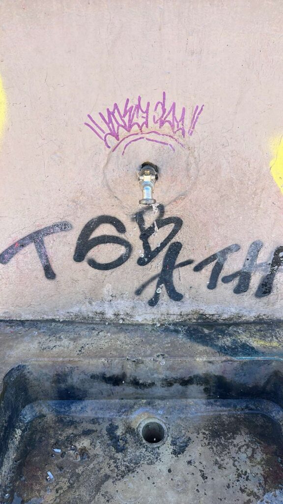 Οι εικόνες μιλούν από μόνες τους: ανεξέλεγκτα γκράφιτι στους τοίχους, κατεστραμμένα παιχνίδια στην παιδική χαρά και μια σπασμένη βρύση που συνεχίζει να τρέχει εδώ και μέρες, σπαταλώντας νερό. Η πλατεία, που θα έπρεπε να είναι σημείο συνάντησης για οικογένειες, παιδιά και επισκέπτες, θυμίζει περισσότερο ξεχασμένο εργοτάξιο παρά έναν χώρο αναψυχής και ξεκούρασης.