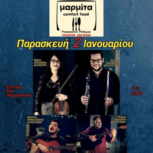 Η Μαρία Δασκαλάκη, ο Γιάννης Κορίνθιος, ο Χρήστος Αναγνωστάκης και ο Βασίλης Δασκαλάκης σε ένα live με έντεχνο, ροκ και παραδοσιακό ρεπερτόριο, στην Ταβέρνα «Μαρμίτα» στο Ρουσσοσπίτι Ρεθύμνου.