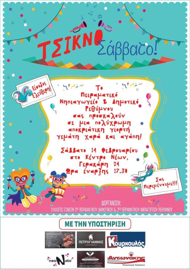 Το Πειραματικό Νηπιαγωγείο και Δημοτικό Ρεθύμνου προσκαλούν μικρούς και μεγάλους σε ένα ξεχωριστό «Τσίκνο Σάββατο» γεμάτο χρώμα, μουσική και αποκριάτικη διάθεση.