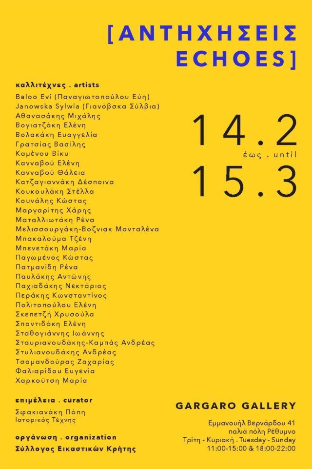 Ο Σύλλογος Εικαστικών Κρήτης σας προσκαλεί στην ομαδική εικαστική έκθεση με θέμα «Αντηχήσεις (Echoes)» η οποία θα φιλοξενηθεί στη GARGARO GALLERY (Εμμ. Βερνάρδου 41) στο Ρέθυμνο, από τις 14 Φεβρουαρίου έως και τις 15 Μαρτίου 2026.