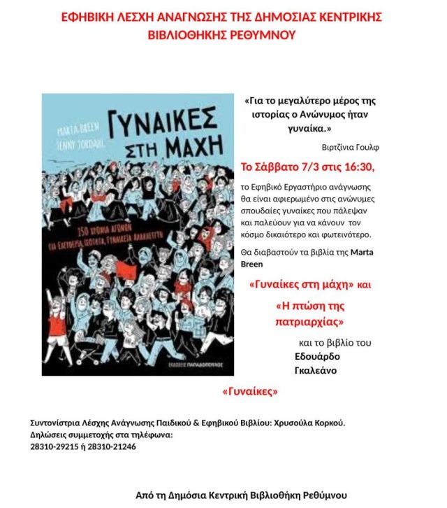 Θα διαβαστούν τα βιβλία της Μarta Breen «Γυναίκες στη μάχη» και «Η πτώση της πατριαρχίας» και το βιβλίο του Εδουάρδο Γκαλεάνο «Γυναίκες»