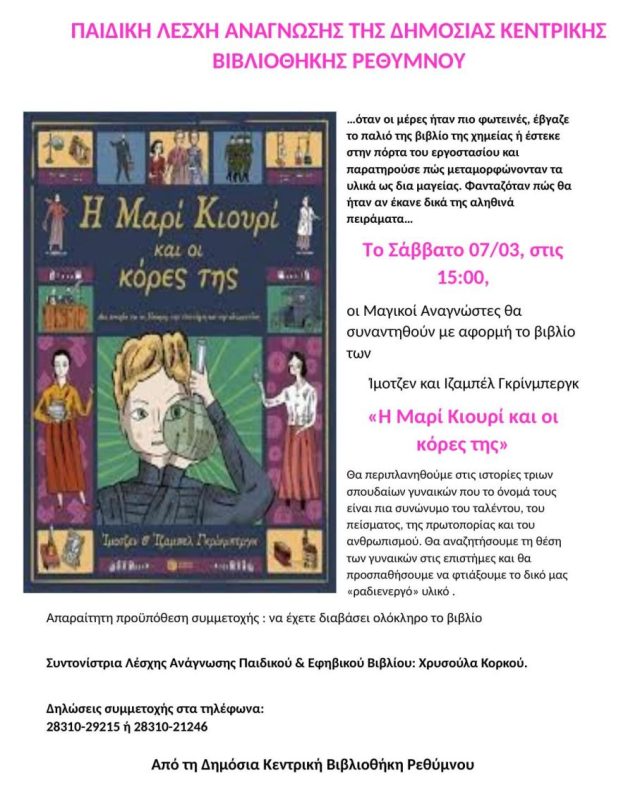 Το Σάββατο 07/03, στις 15:00, οι Μαγικοί Αναγνώστες θα συναντηθούν με αφορμή το βιβλίο των Ίμοτζεν και Ιζαμπέλ Γκρίνμπεργκ «Η Μαρί Κιουρί και οι κόρες της»