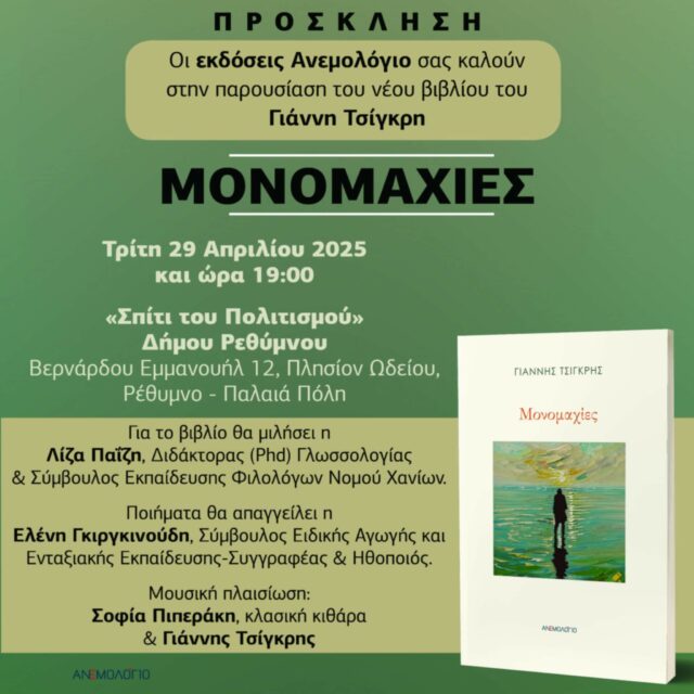Οι εκδόσεις Ανεμολόγιο και ο συγγραφέας Γιάννης Τσίγκρης προσκαλούν το κοινό στην παρουσίαση του νέου του βιβλίου με τίτλο «Μονομαχίες», την Τρίτη 29 Απριλίου 2025, στις 19:00, στο «Σπίτι του Πολιτισμού» του Δήμου Ρεθύμνου (Βερνάρδου 12, Παλιά Πόλη).