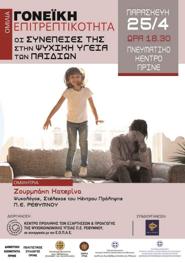 Το Κέντρο Πρόληψης των Εξαρτήσεων και Προαγωγής της Ψυχοκοινωνικής Υγείας Π.Ε Ρεθύμνης, στα πλαίσια της συνεργασίας του με τους Δήμους της Π.Ε. Ρεθύμνου, την Ιερά Μητρόπολη Ρεθύμνης και Αυλοποτάμου και την Ιερά Μητρόπολη Λάμπης και Σφακίων, τις Διευθύνσεις Πρωτοβάθμιας και Δευτεροβάθμιας Διεύθυνσης Ρεθύμνου και τους κατά τόπους φορείς και Πολιτιστικούς Συλλόγους συνεχίζει τη σειρά ομιλιών για γονείς με θέμα: «Γονεϊκή Επιτρεπτικότητα: οι συνέπειες στην ψυχική ζωή των παιδιών», σε όλη την Περιφερειακή ενότητα Ρεθύμνου.