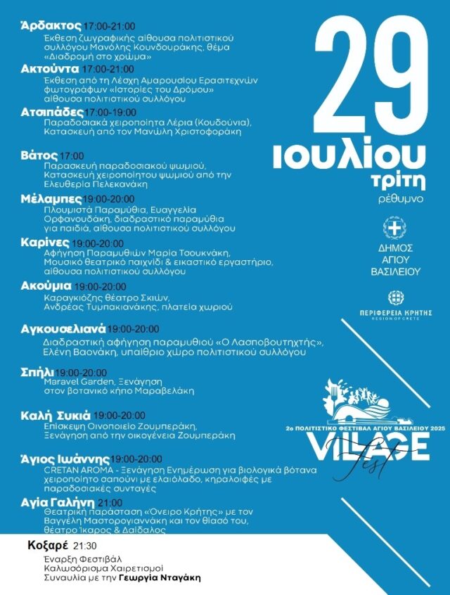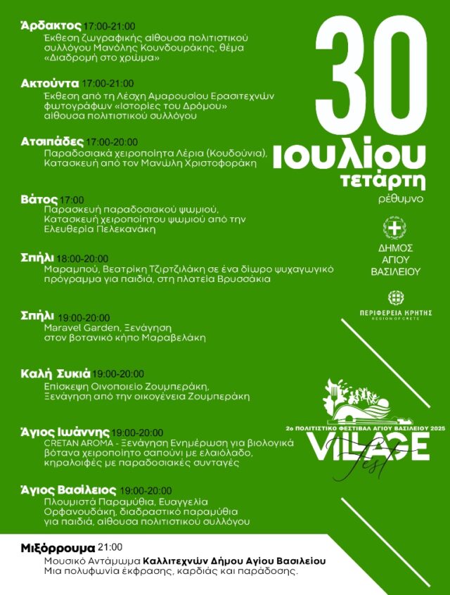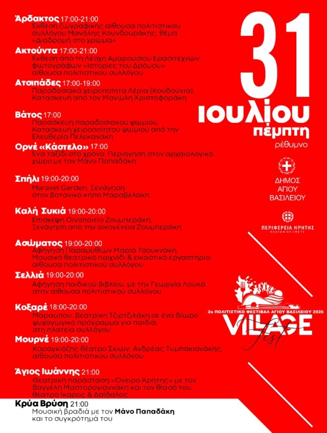 Με ιδιαίτερη χαρά σας ανακοινώνουμε το πρόγραμμα του 2ου Φεστιβάλ του Δήμου Αγίου Βασιλείου, ενός θεσμού που συνεχίζεται με επιτυχία, δυναμική και ακόμα μεγαλύτερο μεράκι και αγάπη.