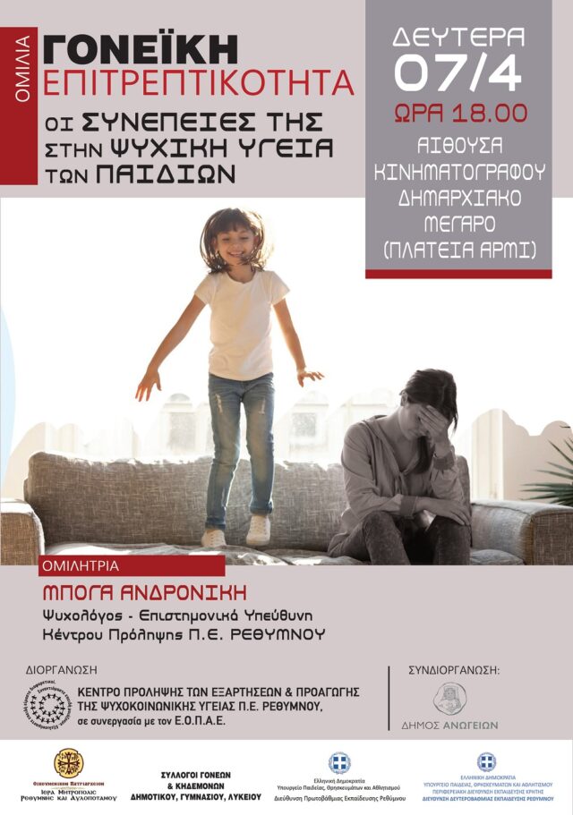 Το Κέντρο Πρόληψης των Εξαρτήσεων και Προαγωγής της Ψυχοκοινωνικής Υγείας Π.Ε Ρεθύμνης, στα πλαίσια της συνεργασίας του με τους Δήμους της Π.Ε. Ρεθύμνου, την Ιερά Μητρόπολη Ρεθύμνης και Αυλοποτάμου και την Ιερά Μητρόπολη Λάμπης και Σφακίων, τις Διευθύνσεις Πρωτοβάθμιας και Δευτεροβάθμιας Διεύθυνσης Ρεθύμνου και τους κατά τόπους φορείς και Πολιτιστικούς Συλλόγους υλοποιεί σειρά ομιλιών για γονείς με θέμα: «Γονεϊκή Επιτρεπτικότητα: οι συνέπειες στην ψυχική ζωή των παιδιών», σε όλη την Περιφερειακή ενότητα Ρεθύμνου.