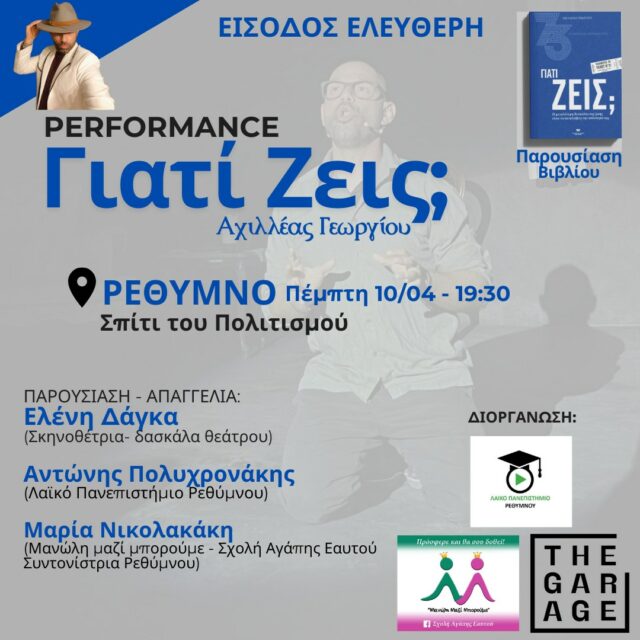 Συνδιοργάνωση: Λαϊκό Πανεπιστήμιο Ρεθύμνου – Σχολή Αγάπης Εαυτού Ρεθύμνου – The Garage Theatre