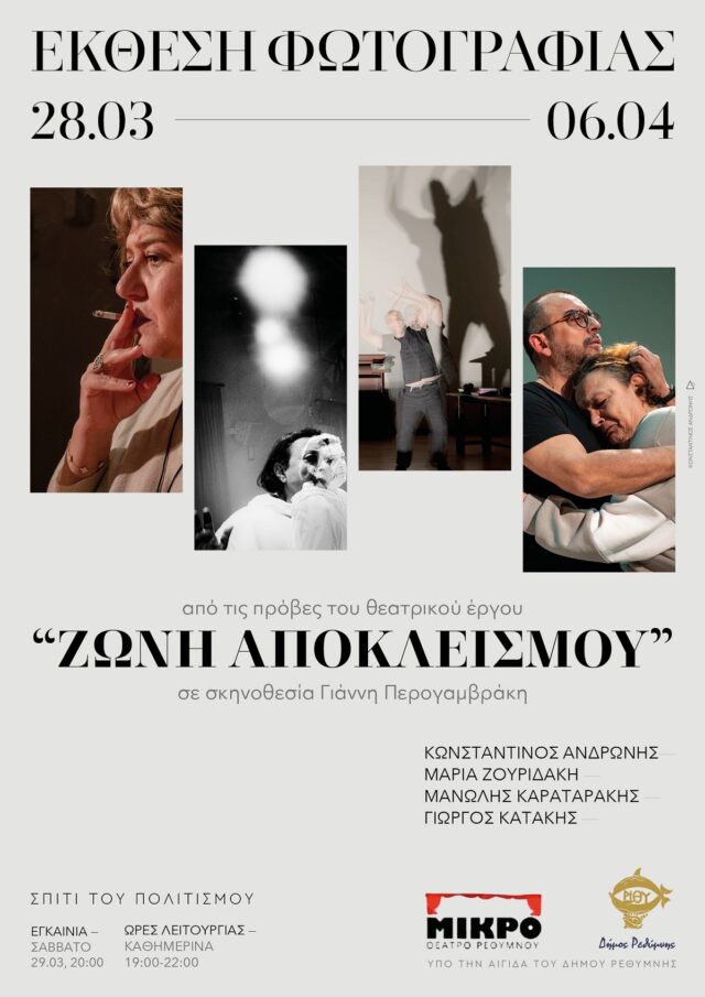 Το Μικρό Θέατρο Ρεθύμνου συνεχίζει την πορεία του στον θεατρικό χώρο του Ρεθύμνου με την «Ζώνη Αποκλεισμού», ένα έργο βασισμένο στο “The Children” της βραβευμένης Βρετανίδας συγγραφέα Lucy Kirkwood, σε σκηνοθεσία Γιάννη Περογαμβράκη.