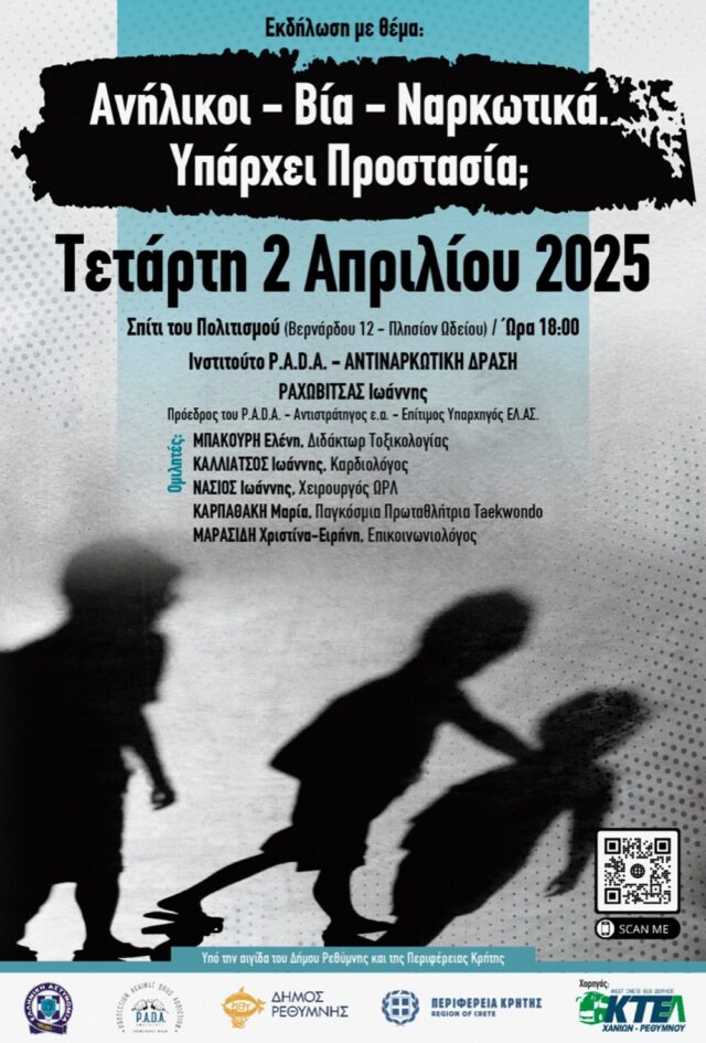 Μια σημαντική εκδήλωση από το Ινστιτούτο P.A.D.A. – Αντιναρκωτική Δράση, με τη συμμετοχή ειδικών και επιστημόνων που θα μιλήσουν για την προστασία των ανηλίκων από τη βία και τα ναρκωτικά, θα πραγματοποιηθεί την Τετάρτη 2 Απριλίου 2025 και ώρα 18:00 στο Σπίτι του Πολιτισμού, Βερνάδου 12, Παλιά πόλη – Ρέθυμνο.