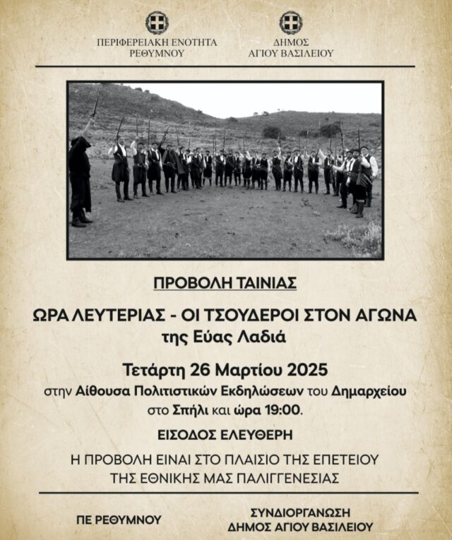 Τετάρτη 26 Μαρτίου στη Σητεία, στον κινηματογράφο «Μίνωα»(Αλ. Παπαναστασίου 18 τηλ:28430 25150)