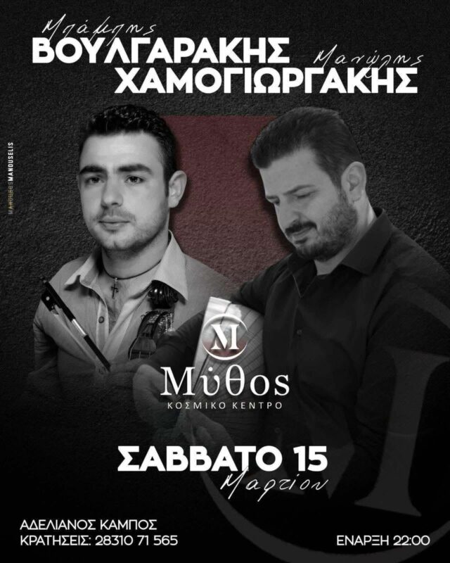 Το Σάββατο 15 Μαρτίου, ο Μπάμπης Βουλγαράκης και ο Μανόλης Χαμογιωργάκης σας περιμένουν στο Κοσμικό Κέντρο Μύθος (Αδελιανός Κάμπος, Ρέθυμνο) για μία όμορφη κρητική βραδιά.