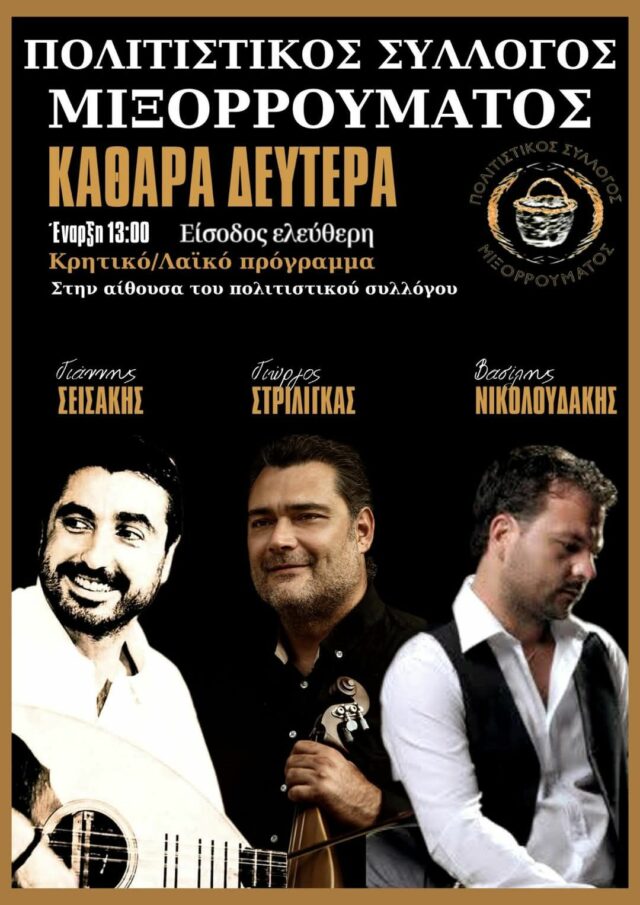 Ο Πολιτιστικός Σύλλογος Μιξορρούματος σας προσκαλεί σε μια ξεχωριστή μουσική εκδήλωση την Καθαρά Δευτέρα, με ένα μοναδικό κρητικό-λαϊκό πρόγραμμα με τους Γιάννη Σεισάκη, Γιώργο Στριλιγκά και Βασίλη Νικολουδάκη.