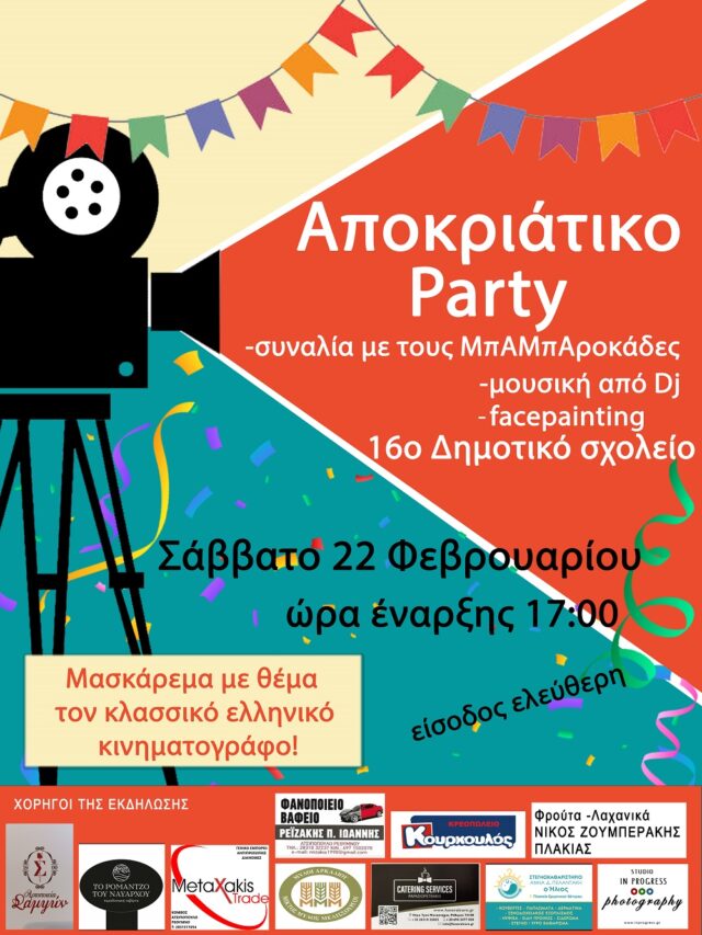 Με χαρά σας ανακοινώνουμε ότι το Σάββατο 22 Φεβρουαρίου 2025 και ώρα 17:00 στο Σχολείο μας διοργανώνουμε το Αποκριάτικο πάρτυ μας με θέμα αποκριάτικης στολής, τον παλιό ελληνικό κινηματογράφο.