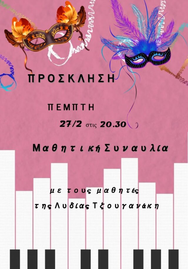 Η συναυλία θα πραγµατοποιηθεί την Πέµπτη 27/2/2025 στις 8.30 µ.µ, στην αίθουσα εκδηλώσεων του 2ου ∆ηµοτικού Σχολείου. Πρόκειται για µια ξεχωριστή βραδιά γεµάτη µελωδίες και όµορφες στιγµές, στην οποία η παρουσία σας θα είναι τιµή για εµάς.
