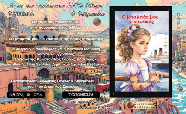 Οι Εκδόσεις «Συμπαντικές Διαδρομές» διοργανώνουν το Λογοτεχνικό Φεστιβάλ “Όψεις του Φανταστικού” στην Κρήτη. Στο πλαίσιο της διοργάνωσης θα πραγματοποιηθεί η παρουσίαση του παιδικού βιβλίου της Αλίκης Μπαλασάκη “Ο μπαμπάς μου… ο ναυτικός“.