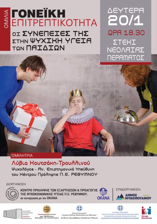 Το Κέντρο Πρόληψης των Εξαρτήσεων και Προαγωγής της Ψυχοκοινωνικής Υγείας Π.Ε Ρεθύμνης, σας προσκαλεί σε ομιλία για γονείς με θέμα: «Γονεϊκή Επιτρεπτικότητα: οι συνέπειες στην ψυχική ζωή των παιδιών», τη Δευτέρα 20/01/2025 και ώρα 18.30, στο Στέκι Νεολαίας Περάματος, σε συνεργασία με την Ιερά Μητρόπολη Ρεθύμνης και Αυλοποτάμου, το Δήμο Μυλοποτάμου, τον Πολιτιστικό Σύλλογο Περάματος Μυλοποτάμου, το Κέντρο Κοινότητας και τις Διευθύνσεις Πρωτοβάθμιας και Δευτεροβάθμιας Διεύθυνσης Ρεθύμνου.