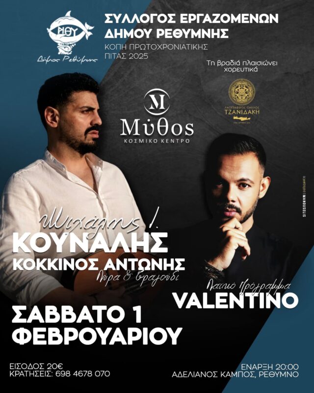 Κοπή Πρωτοχρονιάτικης Πίτας του Συλλόγου Εργαζομένων Δήμου Ρεθύμνου θα πραγματοποιηθεί το Σάββατο 1 Φεβρουαρίου 2025, στο Κοσμικό Κέντρο – Ταβέρνα «Μύθος», στον Αδελιανο Κάμπο Ρεθύμνου.
