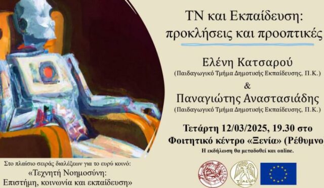 Η διάλεξη θα πραγματοποιηθεί την Τετάρτη 12 Μαρτίου 2025, στις 19:30 στο Φοιτητικό Κέντρο Ξενία (έναντι Μαρίνας Ρεθύμνου, είσοδος από Νικ. Ψαρρού 46) και έχει θέμα: «Τεχνητή Νοημοσύνη και Εκπαίδευση: προκλήσεις και προοπτικές».