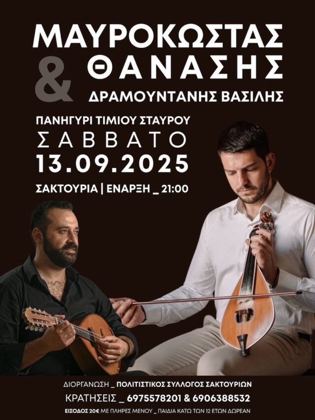 Ο Πολιτιστικός Σύλλογος Σακτουρίων διοργανώνει το πανηγύρι του Τιμίου Σταυρού το Σάββατο 13 Σεπτεμβρίου 2025, με το συγκρότημα του Θανάση Μαυροκώστα και του Βασίλη Δραμουντάνη.