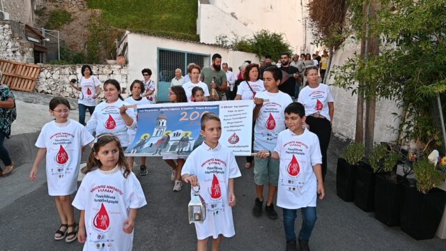 Η πομπή διέσχισε όλο το χωριό μέχρι που κατέληξε στον μοναδικό σε θέα αύλειο χώρο του καθεδρικού Ι. Ναού των Αγίων Τεσσάρων Μαρτύρων, όπου και ανέμεναν οι εκπρόσωποι του συλλόγου «Δότες Ζωής», των Λαογραφικών συλλόγων και μέλη της μηχανοκίνητης Ομάδας «Μόρτες». Αφού ο Εφημέριος της Ενορίας, π. Ευάγγελος Τσουρδαλάκης, καλωσόρισε όλους τους προσκυνητές των Αγίων 4 Μαρτύρων και φίλους του εθελοντισμού στις Μέλαμπες και στην εκδήλωση, υπογράμμισε ότι πολύ εύστοχα η φετινή λαμπαδηδρομία τέθηκε υπό το φως και τη σκέπη των Αγίων, δεδομένου ότι η καλλιέργεια του πνεύματος της εθελοντικής αιμοδοσίας, αποτελεί κατ’ αναλογίαν μίμηση της θυσίας του αίματος των Αγίων, γιατί μοναδικό κίνητρο και τα δύο γεγονότα έχουν την αγάπη προς το Θεό και προς το συνάνθρωπο.