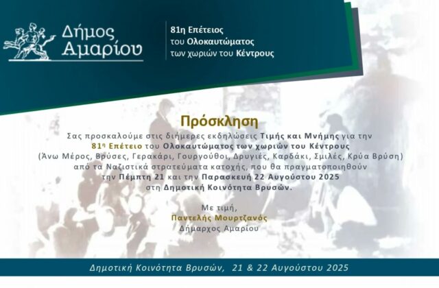 Σας προσκαλούμε στις διήμερες εκδηλώσεις Τιμής και Μνήμης για την 81η Επέτειο του Ολοκαυτώματος των χωριών του Κέντρους (Άνω Μέρος, Βρύσες, Γερακάρι, Γουργούθοι, Δρυγιές, Καρδάκι, Σμιλές, Κρύα Βρύση) από τα ναζιστικά στρατεύματα κατοχής, που θα πραγματοποιηθούν την Πέμπτη 21 και την Παρασκευή 22 Αυγούστου 2025 στη Δημοτική Κοινότητα Βρυσών.
