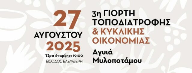 Στο πλαίσιο του Θερινού Φεστιβάλ Μυλοποτάμου, ο Δήμος Μυλοποτάμου σε συνδιοργάνωση με την Εκπαιδευτική Αναπτυξιακή ΠΛΟΗΓΟΣ και υπό την αιγίδα της Περιφέρειας Κρήτης, παρουσιάζουν την 3η Γιορτή Τοποδιατροφής & Κυκλικής Οικονομίας, που φέτος θα φιλοξενηθεί στην Αγιά από τον Πολιτιστικό Σύλλογο Αγυιάς «Ο Διοματάς».