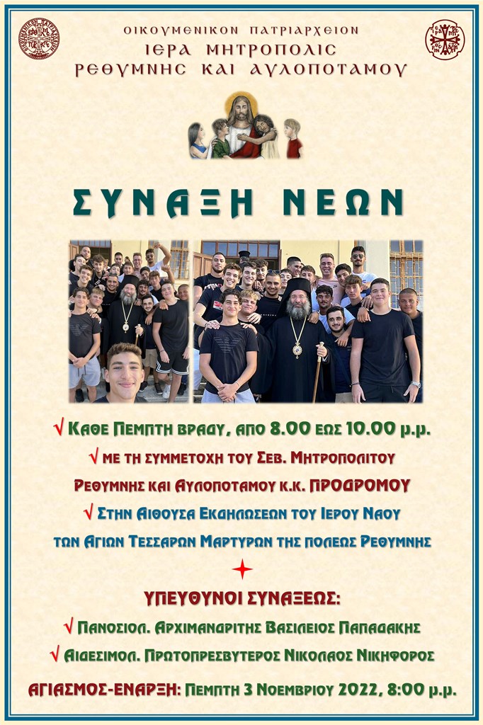 Ανακοινώνεται ότι ξεκινά προσεχώς τη λειτουργία της για το τρέχον εκπαιδευτικό έτος 2022-2023 η Σύναξη Νέων της Ιεράς Μητροπόλεως Ρεθύμνης και Αυλοποτάμου, οι συναντήσεις της οποίας θα πραγματοποιούνται κάθε Πέμπτη βράδυ, από 8:00 μ.μ. έως 10:00 μ.μ., στην αίθουσα εκδηλώσεων του Ιερού Ναού των Αγίων Τεσσάρων Μαρτύρων της πόλεως Ρεθύμνης, με τη συμμετοχή του Σεβ. Μητροπολίτου Ρεθύμνης και Αυλοποτάμου κ. Προδρόμου.