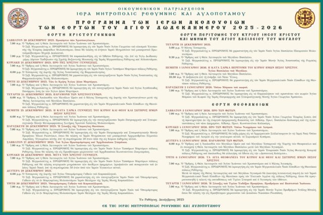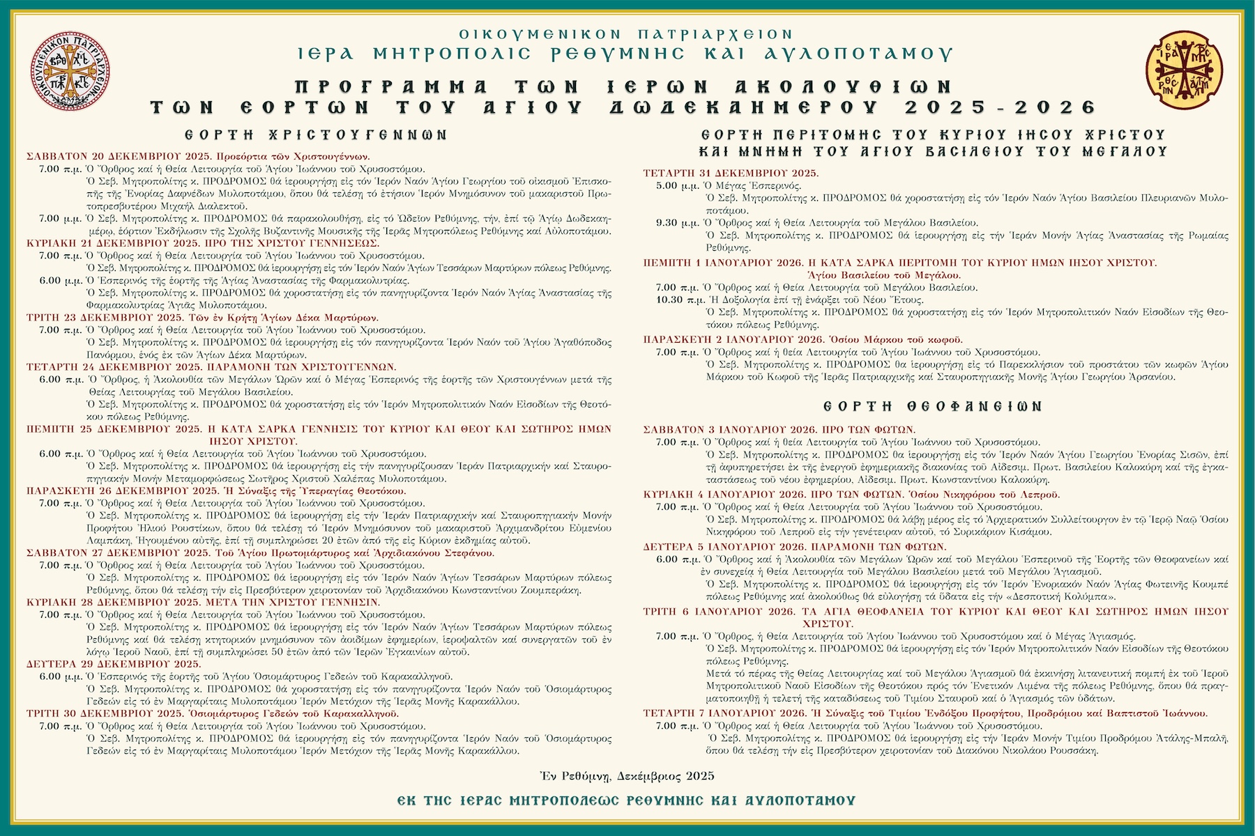 Δείτε το πρόγραμμα των ιερών ακολουθιών του Αγίου Δωδεκαημέρου 2025 – 2026 όπως ανακοινώθηκε από την Ιερά Μητρόπολη Ρεθύμνης και Αυλοποτάμου: