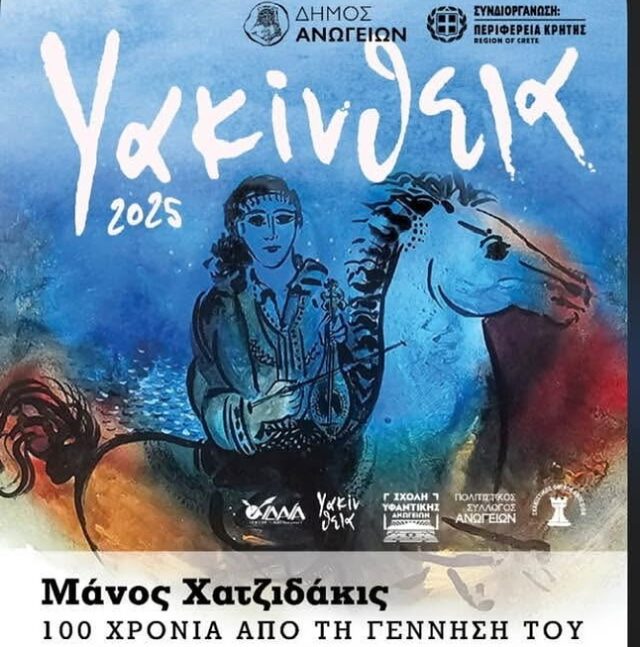 Ο Δήμος Ανωγείων, τα Υακίνθεια, ο Πολιτιστικός Σύλλογος Ανωγείων η Σχολή Υφαντικής Ανωγείων και ο Σκακιστικός όμιλος Ανωγείων τιμούν φέτος τα 100 χρόνια από τη γέννηση του Μάνου Χατζιδάκι, με πλήθος εκδηλώσεων καθ όλη τη διάρκεια του έτους αρχής γενομένης με το πλούσιο πρόγραμμα των Υακινθείων – εκδηλώσεων πολιτισμού.