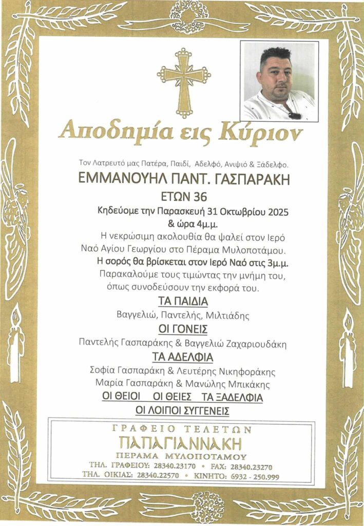 Η είδηση του θανάτου του έχει σκορπίσει θλίψη στην τοπική κοινωνία του Περάματος Μυλοποτάμου.