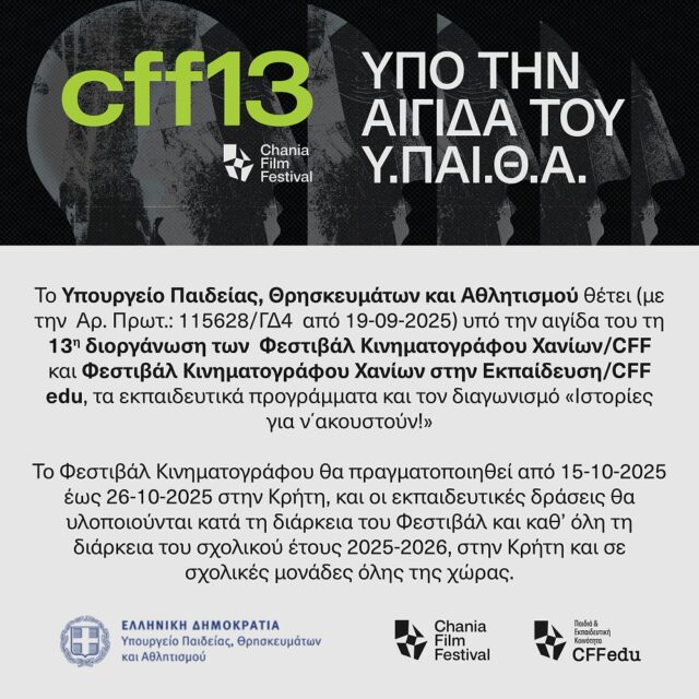 Το Υπουργείο Παιδείας, Θρησκευμάτων και Αθλητισμού θέτει [ με την Αρ. Πρωτ.: 115628/ΓΔ4 από 19-09-2025 ] υπό την αιγίδα του τη 13η διοργάνωση των Φεστιβάλ Κινηματογράφου Χανίων/CFF και Φεστιβάλ Κινηματογράφου Χανίων στην Εκπαίδευση/CFF edu