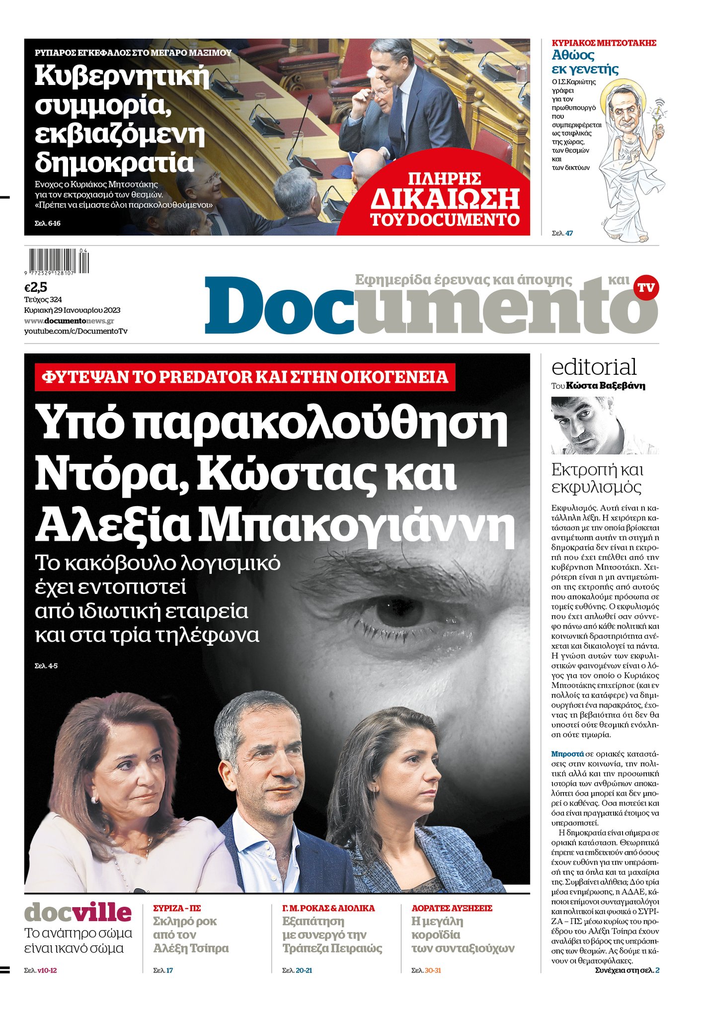 Σε παρακολούθηση μέσω του συστήματος Predator βρισκόταν το σύνολο της οικογένειας Μπακογιάννη, σύμφωνα με το πρωτοσέλιδο της εφημερίδας Documento την Κυριακή (29/1), που επιβεβαιώνει την αποκάλυψη της εφημερίδας «Εστία» πριν από μια εβδομάδα.