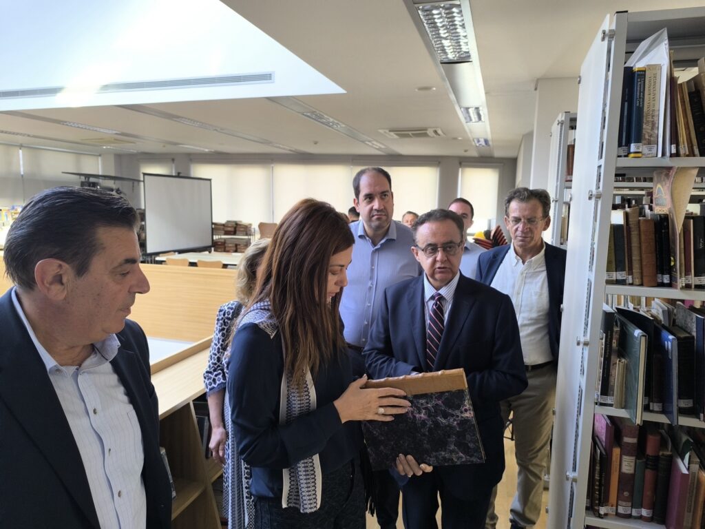 Κατά την ξενάγηση στους χώρους, η Υπουργός είχε την ευκαιρία να ενημερωθεί για το σπάνιο και πλούσιο έντυπο υλικό που διαθέτει η Βιβλιοθήκη, καθώς και για τον κομβικό ρόλο της ως πυρήνα γνώσης και πολιτισμού για την τοπική κοινωνία.